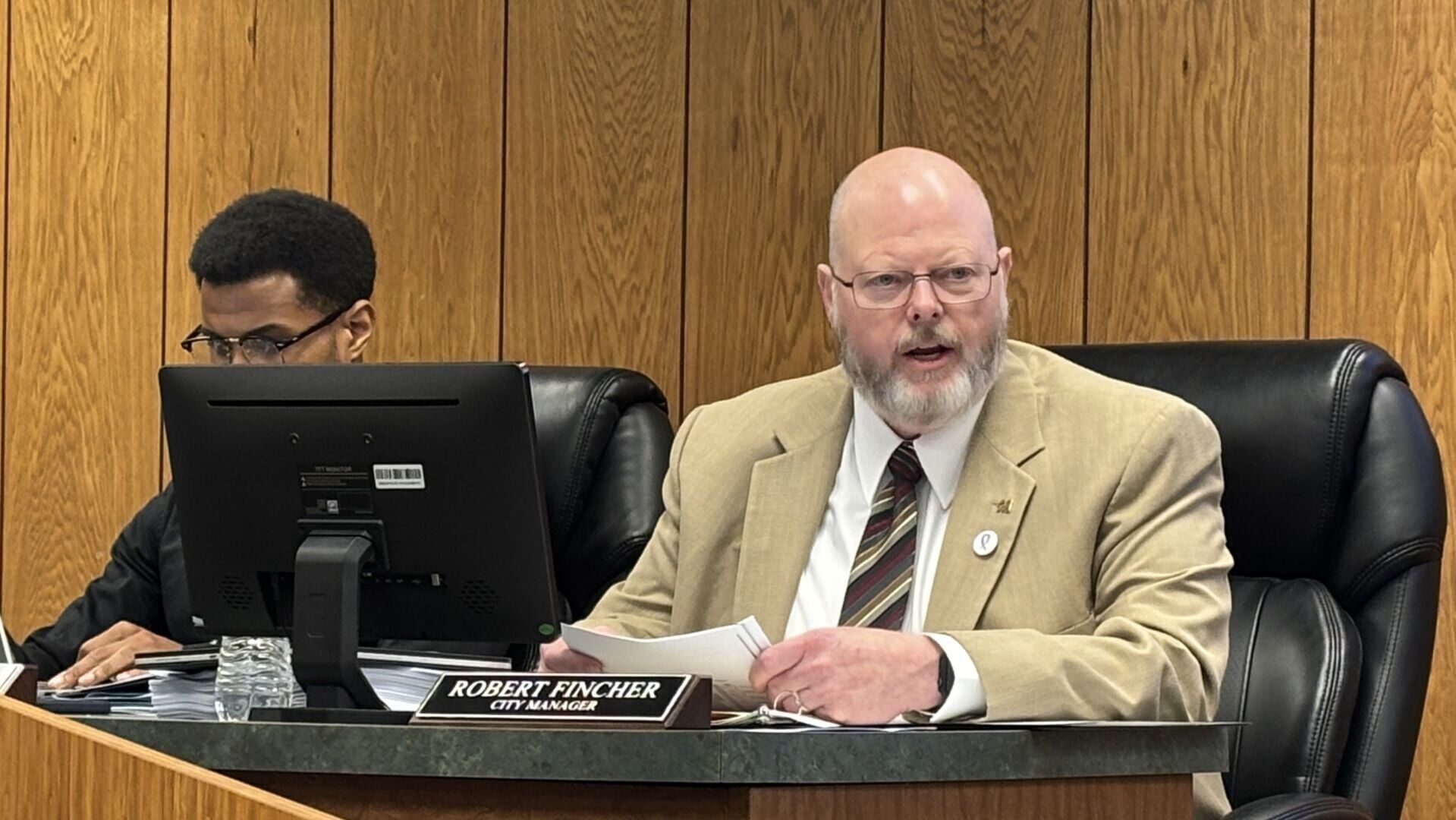 City Manager Rob Fincher (at right) explains changes to the city's financial operations resulting from a forensic audit.