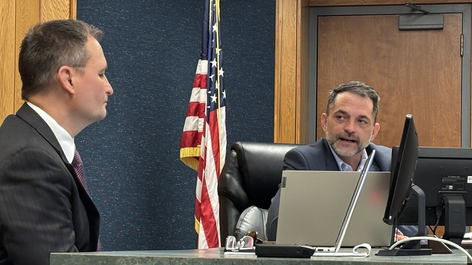 Sands Anderson Attorney Stephen Durbin (from left) discusses the release of a long-awaited forensic audit involving former City Manager Aretha Ferrell-Benavides with Councilman Julian Mei.